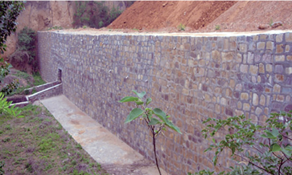 使用塊狀或片狀石頭,現(xiàn)場慢慢堆積,水泥砂漿填補(bǔ)細(xì)縫促其粘黏而成。石料可以就地選取,是山區(qū)使用最多的重力式擋土墻。漿砌石擋土墻墻體剛硬度較大,可以支撐和遮擋高強(qiáng)度、高重量物品沖擊,且施工部署靈活、施工選材便捷、施工成本較低,很多地勢復(fù)雜山體斜坡處都選用漿砌石擋土墻。缺點(diǎn)是墻體自身重量大,對地基壓迫承載量高,長期使用會(huì)導(dǎo)致山區(qū)斜坡下滑變形。適用于山體石料富裕、地基土質(zhì)好、水流沖擊嚴(yán)重、坡度大于45°的岸坡地段。