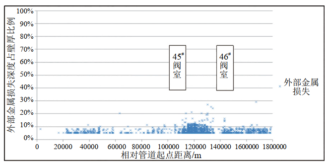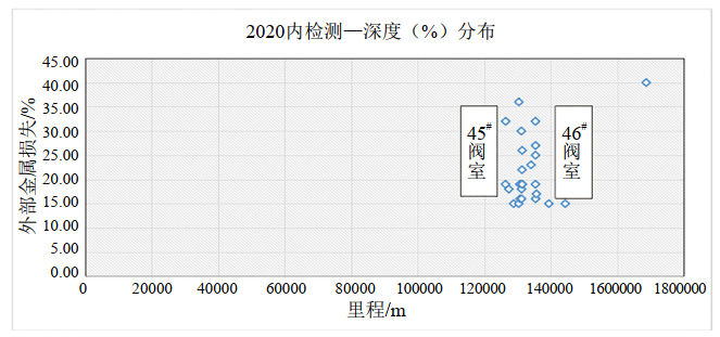圖 3 良西段內(nèi)檢測(cè)深度大于15%外部金屬損失分布