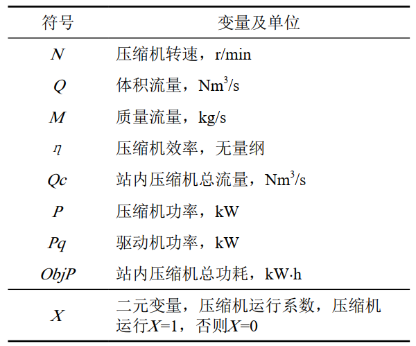 (2)決策變量。①壓縮機(jī)運(yùn)行決策:不同時期機(jī)組運(yùn)行方案(哪幾臺壓縮機(jī)運(yùn)行,每臺壓縮機(jī)的轉(zhuǎn)速、流量等);②設(shè)備能耗:不同時期壓縮機(jī)組驅(qū)動機(jī)能耗。