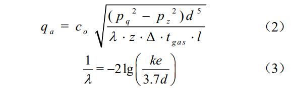 根據(jù)假設(shè),本壓氣站到下游站的管道為水平管道,水平管道水力計(jì)算公式及水力摩阻系數(shù)計(jì)算公式分別見式(2)、式(3):
