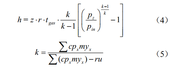 離心式壓縮機(jī)的能頭及絕熱系數(shù)計(jì)算分別見式(4)、式(5):