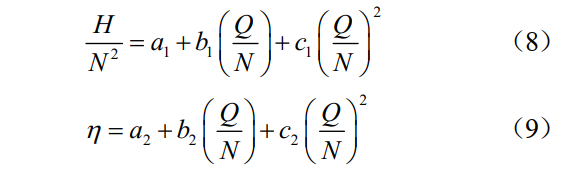 壓縮機(jī)特性曲線是指在進(jìn)氣狀態(tài)一定的條件下,轉(zhuǎn)速、多變效率與進(jìn)氣量之間的關(guān)系,反映機(jī)組運(yùn)行時工況的變化,通常用特性方程來表征特性曲線。離心壓縮機(jī)的特性方程見式(8)、式(9)[10]: