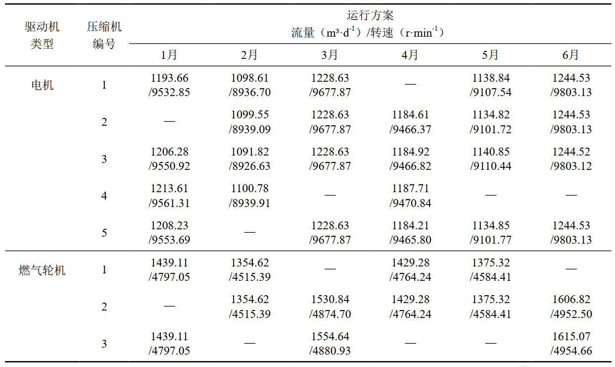 優(yōu)化后得到了詳細(xì)的壓縮機(jī)組運(yùn)行方案,如表 5所示,據(jù)此可以調(diào)整壓氣站壓縮機(jī)組運(yùn)行策略。例如,1月時,依據(jù)求得的轉(zhuǎn)速,運(yùn)行電驅(qū)1、3、4、5號機(jī)以及燃驅(qū)1、3號機(jī)最優(yōu)。
