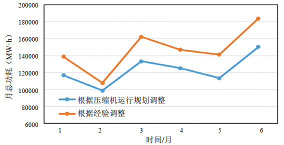 優(yōu)化后機(jī)組總能耗與根據(jù)經(jīng)驗(yàn)制定運(yùn)行方案的機(jī)組總能耗對比如圖 5所示,可以看出,合理決策壓縮機(jī)的運(yùn)行方案能夠降低能耗,節(jié)省運(yùn)行成本,減少碳排放。對現(xiàn)場調(diào)整機(jī)組運(yùn)行方案具有指導(dǎo)意義。