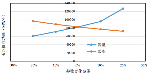 考慮到輸氣指定量、驅(qū)動機(jī)效率的不確定性,利用控制變量法進(jìn)行了敏感性分析,以量化當(dāng)其他參數(shù)保持在基準(zhǔn)值時,每個單獨(dú)參數(shù)對機(jī)組總能耗的影響。由圖 6可以看出,機(jī)組總能耗與輸氣量呈正相關(guān),與驅(qū)動機(jī)效率呈負(fù)相關(guān),輸氣指定量對機(jī)組總能耗的影響較大,但驅(qū)動機(jī)效率的影響仍不容小覷。