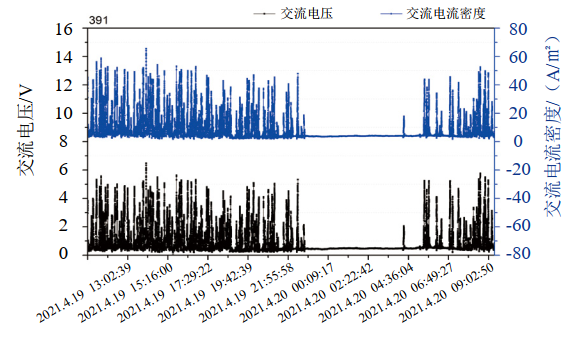 圖 5 391#測試樁24 h交流電壓和交流電流密度波動圖