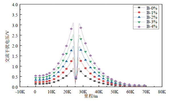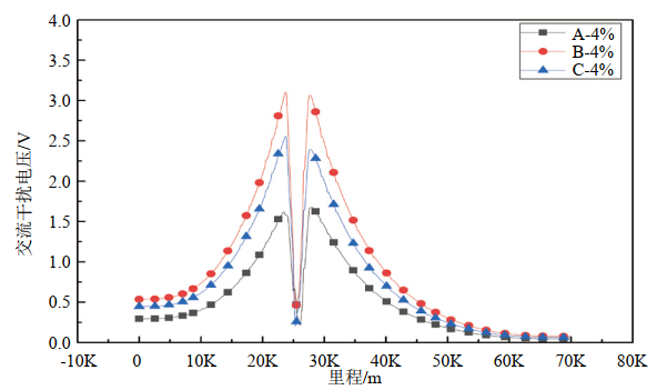 在不同相位的不平衡度分別達到4%,管道沿線的交流電壓和交流電流密度模擬計算結(jié)果見圖 6。結(jié)果顯示,不同相保持不平衡度時,管道的交流干擾程度差異性較大,其中在B相不平衡度為4%時,管道受到的交流干擾最大。