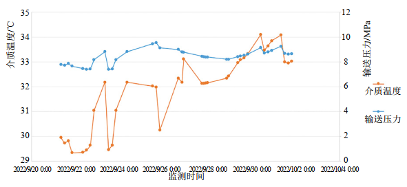 (2)圖 3為上游70#閥室輸送壓力與介質輸送溫度關系曲線,在應力釋放期間輸送壓力7.38 MPa~9.54 MPa,介質溫度29.34 ℃~34.09 ℃,兩者之間不存在正相關。