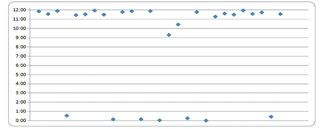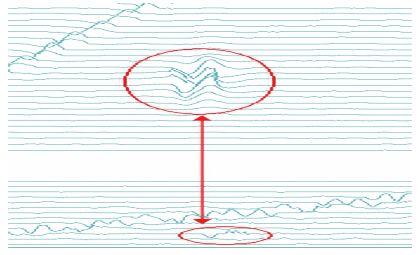 實際工程應(yīng)用發(fā)現(xiàn),工業(yè)現(xiàn)場管道盜油孔周向位置普遍處于管道頂部09:00~00:30時鐘方向(圖 2)。在依據(jù)實際管道檢測數(shù)據(jù)分析盜油孔時,需要重點對8:00~4:00(順時針)即管道頂部的疑似小開孔信號進(jìn)行篩查,能最大限度排查管道盜油孔。