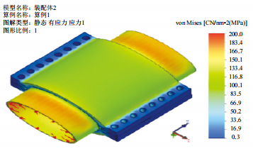 沒(méi)有管路約束時(shí)卡具的應(yīng)力分析結(jié)果。通過(guò)分析卡具殼體Y向位移,在弧頂處最大位移為6.8 mm,耳板內(nèi)側(cè)的張口為2.04 mm(圖 1)。變形量已經(jīng)超出密封允許范圍,肯定無(wú)法實(shí)現(xiàn)承壓密封。根據(jù)分析結(jié)果多方查找原因,最終認(rèn)為沒(méi)加管路約束進(jìn)行有限元分析,有悖于卡具的實(shí)際使用情況,卡具殼體失去管路約束,自然會(huì)產(chǎn)生較大變形。