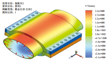 增加管路約束后卡具有限元分析。上下耳板接觸內(nèi)側(cè)張口1.66 mm,弧頂處最大位移為3.1 mm(圖 2、圖 3)。弧頂處位移偏大,可能會(huì)出現(xiàn)承壓泄漏的情況。