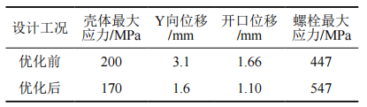 如表 2所示,優(yōu)化后卡具殼體的最大應(yīng)力有所降低,殼體弧頂?shù)奈灰泼黠@減小,開(kāi)口位移減小了34%,螺栓應(yīng)力有所增高,這是由于殼體壁厚減小后,液壓載荷的作用使螺栓承受較大的拉力,但應(yīng)力仍小于ASME《鍋爐及壓力容器規(guī)范VIII》規(guī)定的屈服強(qiáng)度。卡具變形張口滿(mǎn)足密封承壓要求,可達(dá)到承壓10 MPa不泄漏的預(yù)期指標(biāo)。