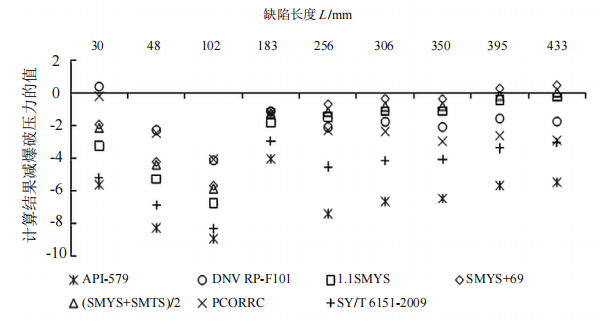 圖 6 各方法計算結果與爆破壓力差值隨缺陷長度L變化圖