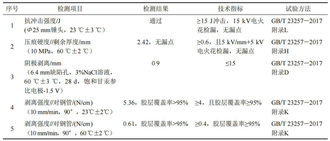 (3)內(nèi)外防腐層檢測。內(nèi)防腐層檢測項(xiàng)目及結(jié)果見表 3。