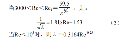 水力摩阻系數(shù)λ是雷諾數(shù)Re和管壁相對當(dāng)量粗糙度的函數(shù),隨流態(tài)的不同而不同。對于牛頓流體,流體在管路中的流態(tài)按雷諾數(shù)來劃分,在不同的流態(tài)區(qū),水力摩阻系數(shù)與雷諾數(shù)及管壁粗糙度的關(guān)系不同,長距離原油管道一般運(yùn)行在紊流態(tài)水力光滑區(qū),常用式(2),這樣就可以根據(jù)一個(gè)站間沿程摩阻計(jì)算平均結(jié)蠟厚度。