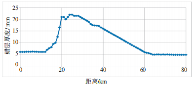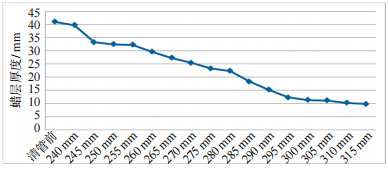 從圖 3可以看出,管道沿線均有蠟的沉積物且分布不均,蠟層厚度在出站20 km~30 km的中間管段達(dá)到峰值,最厚為20 mm左右,隨著距離的增加,結(jié)蠟厚度逐漸變薄。