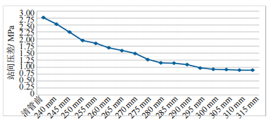 管道清管前站間壓差由投產(chǎn)時(shí)的0.90 MPa增高至2.75 MPa,理論計(jì)算結(jié)蠟厚度達(dá)40 mm,嚴(yán)重影響輸送安全和輸送效率。通過發(fā)送 17次泡沫清管器,降壓效果明顯。作業(yè)過程中沒有引起大面積的結(jié)蠟脫落,清管期間站間壓差波動幅值控制在0.1 MPa以內(nèi),累計(jì)收出結(jié)蠟約1300 kg。清管作業(yè)期間管道理論結(jié)蠟厚度和壓差變化分別如圖 4和圖 5所示。