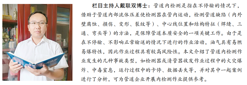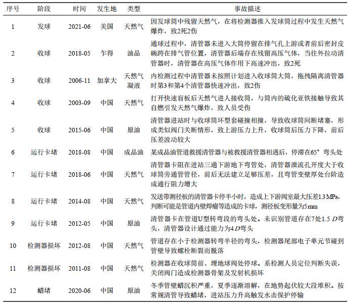 管道內(nèi)檢測實施前,應制定適合的內(nèi)檢測工作流程,包括內(nèi)檢測技術與設備選型、檢測器性能驗證、踏線設標、管道清管/測徑、運行檢測器、數(shù)據(jù)分析和開挖驗證,其中清管和內(nèi)檢測階段風險最大。影響檢測器正常運行的因素較多,包括管道收發(fā)球裝置尺寸和結構、管道管徑、三通、閥門、彎頭和管道壓力、流量以及現(xiàn)場操作等。近年國內(nèi)外開展內(nèi)檢測(含清管)作業(yè)出現(xiàn)了諸如收發(fā)球過程中的火災、殘留高壓氣體引起的設備沖撞、運行過程中的卡停等事故事件(表 1),造成人員傷亡和設備損壞。對此需要引起重視,作業(yè)時應全面識別項目實施過程中存在的風險因素,采取消減和控制措施,擬定異常情況的應急處置預案,確保檢測工作順利實施。