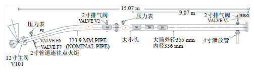 如圖 3所示,收球開始,首先關閉主干線V101隔離閥,通過放空管點火直到壓力降至698.5 kPa,并從V1處注氮置換直到放空管火焰熄滅。然后關閉F6和F7并打開V2,有少量黑色液體噴出,球筒壓力表P1、P2(量程0~6895 kPa)讀數(shù)為0 kPa。從V1移除注氮管并打開閥門繼續(xù)放空,打開盲板開始收球。1#、2#清管器完全進入大筒被輕松取出,3#清管器停在變徑段(大小頭)附近、距離球筒口約7.6 m處,現(xiàn)場人員嘗試用9.1 m長的牽拉工具將其取出。拖拽過程中3#、4#清管器快速沖出撞到操作人員,致1人重傷,1人輕傷。同時黑色液體從V2噴濺而出。