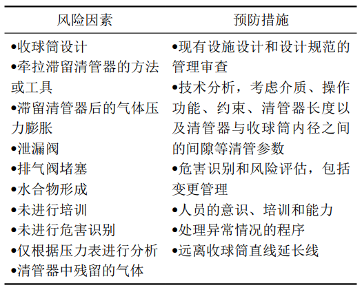 Enbridge公司通過調(diào)查分析,決定將收球筒外徑由355 mm更換為406.4 mm,排氣閥由50.8 mm調(diào)整為101.6 mm;同時審查完善現(xiàn)有操作手冊。2007年4月,加拿大國家能源局(NEB)發(fā)布安全咨詢報告(NEB SA 2007-01),闡述了清管/內(nèi)檢測作業(yè)中的風險因素和預防措施,如表 2所示。