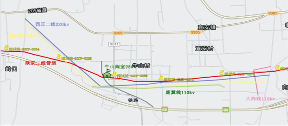 管道高電壓來自閥室周邊及管線的雜散電流干擾。陜京二線25#閥室及管線處在高壓交流輸電網(wǎng)中,閥室周邊有4條高壓線,分別為西正二線220 kv高壓交流輸電線路、西鹿線220 kv高壓交流輸電線路、鹿冀線110 kv高壓交流輸電線路、大向線110 kv高壓交流輸電線路(圖 1)。