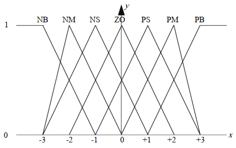 模糊PID控制技術(shù)把天然氣輸配系統(tǒng)中壓力、溫度的模擬量信號轉(zhuǎn)換成實(shí)型數(shù)據(jù),設(shè)置四限報(bào)警(高高、高、低、低低),PV調(diào)節(jié)閥閥位模擬信號轉(zhuǎn)換成整型數(shù)據(jù)用于控制設(shè)計(jì)。模糊推理模型主要通過對PID的誤差(ER)和誤差變化率(EC)進(jìn)行計(jì)算,輸出合理的參數(shù)給PID控制器進(jìn)行調(diào)節(jié)。模糊增量PID控制將誤差及誤差變化分為正大(PB)、正中(PM)、正小(PS)、零(ZO)、負(fù)小(NS)、負(fù)中(NM)、負(fù)大(NB)7個(gè)模糊集,采用三角分布作為隸屬度函數(shù)[7](圖 2)。