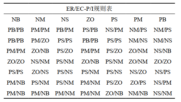 在對調(diào)節(jié)后壓力曲線的實(shí)際追蹤過程中,在保證調(diào)節(jié)曲線收斂的情況下進(jìn)行控制規(guī)則的設(shè)計(jì),模糊PID控制規(guī)則如下:以正向調(diào)節(jié)為例(即誤差為正),誤差先后經(jīng)歷正大到負(fù)大、負(fù)大到正小、正小到零直至趨近穩(wěn)定的幾個(gè)區(qū)域,而相應(yīng)誤差變化則先后經(jīng)歷負(fù)大至零再至正大、負(fù)中至零再至正小,最后為零并趨近穩(wěn)定的幾個(gè)區(qū)域,而反向調(diào)節(jié)則區(qū)間不變,正負(fù)相反。模糊規(guī)則表[7]如表 1所示。