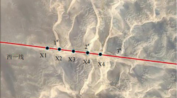 2017年以來,西部管道新疆輸油氣分公司對西一線管道KP788—KP793段穿越庫木塔格沙壟處開展管道應(yīng)變監(jiān)測。選取五個典型截面,其中X1、X2截面布設(shè)于1#沙丘兩端覆沙較薄段, X3、X5截面位于2#沙丘兩端覆沙較薄段,X4截面位于2#沙丘中部覆沙最厚段,截面間距約60 m(圖 4)。