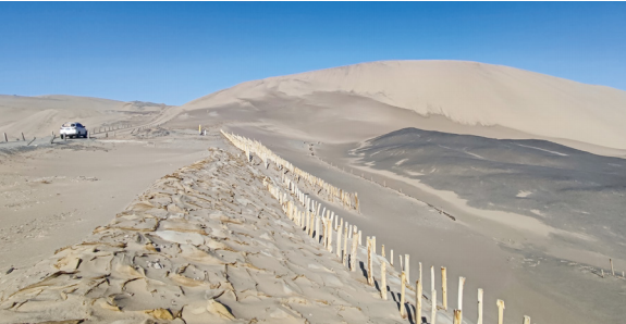 工程防沙指通過在流沙上設(shè)置沙障或其他防沙工程結(jié)構(gòu),人為控制地表的積蝕變化和改變風(fēng)沙流的搬運堆積條件,保護油氣管道、伴行道路免遭風(fēng)沙的危害。工程防沙不受水分條件限制,適用范圍廣、見效快,可作為植物防沙的先導(dǎo)工程。工程防沙能夠因地制宜采用當(dāng)?shù)夭牧希档凸こ淘靸r,在沙害治理中應(yīng)用最為普遍。但工程防沙相對于植物防沙,存在防護年限短,需要經(jīng)常維護、更新的缺點。