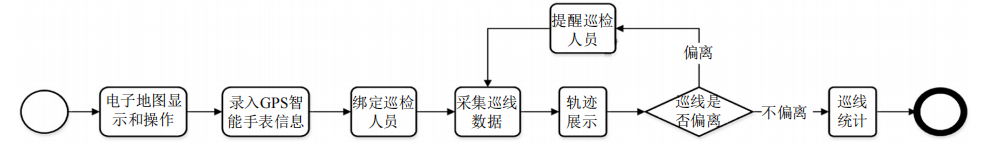 (3)工作流程。首先錄入GPS智能手表信息,然后將其與巡檢人員綁定。巡檢人員佩戴手表巡線,手表自動記錄巡線數(shù)據(jù)。系統(tǒng)采集巡線數(shù)據(jù)并展示巡線軌跡,巡線偏離提醒,統(tǒng)計巡線數(shù)據(jù),實現(xiàn)巡線軌跡查看等功能。工作流程如圖 2所示。