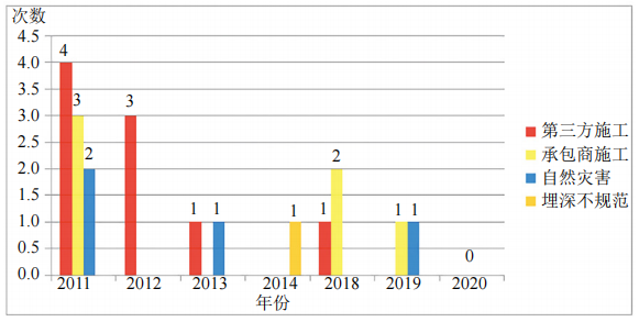 據(jù)統(tǒng)計(jì),2011-2020年共發(fā)生20起管道伴行光纜中斷事件,其中因第三方施工造成9起,承包商施工造成6起,占總數(shù)的75%。2011年各類因素造成斷纜起數(shù)最高,2013-2020年逐年下降。2019-2020年連續(xù)兩年沒有出現(xiàn)因第三方施工造成的斷纜事故(圖 1)。