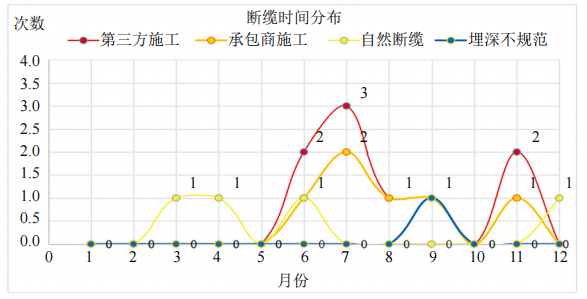 由圖 2可知,斷纜事件主要集中在每年3—12月。其中,第三方施工斷纜、承包商施工斷纜主要發(fā)生在6—11月。根據(jù)管道沿線實(shí)際施工情況,每年5—11月是各方施工的高峰期,同時(shí)也是公司管道環(huán)焊縫開挖檢測(cè)、本體修復(fù)開挖驗(yàn)證和評(píng)價(jià)等項(xiàng)目施工的高峰期。自然災(zāi)害斷纜主要發(fā)生在3—6月,這一時(shí)間段是河道泄洪、融雪性洪水的高發(fā)期。