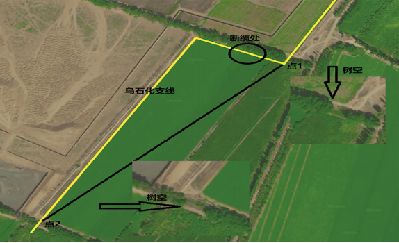 2011年7月,五一農(nóng)場(chǎng)進(jìn)行滴灌改造時(shí)誤將光纜挖斷。斷纜直接原因是某巡線工誤認(rèn)為烏石化支線管道走向?yàn)辄c(diǎn)1到點(diǎn)2的直線(圖 5黑線),在沒有用雷迪儀檢測(cè)管道走向和埋深的情況下,自行同意施工方在距點(diǎn)1約20米的位置實(shí)施挖掘機(jī)作業(yè),該處正位于管道實(shí)際走向正上方(圖 5黃線),施工時(shí)將光纜挖斷。間接原因是風(fēng)險(xiǎn)辨識(shí)不到位,沒按要求及時(shí)上報(bào)第三方施工信息;經(jīng)現(xiàn)場(chǎng)勘查點(diǎn)1和點(diǎn)2各有一處8~10米的樹空隙,僅點(diǎn)1、點(diǎn)2有標(biāo)志樁和轉(zhuǎn)角樁,中間管段沒有設(shè)置標(biāo)識(shí)牌,管道走向和位置不清晰。