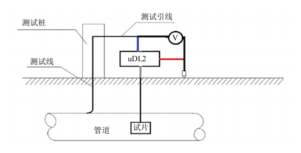 (1)電位測試。采用uDL2數(shù)據(jù)記錄儀與陰極保護(hù)試片(探頭)測試閥室管道與接地網(wǎng)(摘除前和摘除后)通電電位、交流電壓、試片瞬間斷電電位變化等。將管道、試片、參比電極對應(yīng)接入uDL2,其自動(dòng)一次性采集通電電位、斷電電位、交流電壓和交流電流密度(圖 1)。