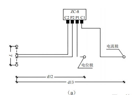 (1)接地電阻測試。采用三角形布極法測量接地系統(tǒng)的接地電阻。如圖 2 a所示,在土壤電阻率較均勻的地區(qū),d13取2 L,d12取L;在土壤電阻率不均勻的地區(qū),d13取3 L,d12取1.7 L(圖 2 b)。測量過程中電位極沿接地體與電流極的連線移動(dòng)三次,每次移動(dòng)距離為d13的5%左右,若三次測試值接近,取其平均值作為長接地體的接地電阻值;若測試值不一致,將電位極往電流極方向移動(dòng),直至測試值接近為止。長接地體的接地電阻也可以采用圖 2所示三角形布極法測試,此時(shí) d13= d12≥2 L。