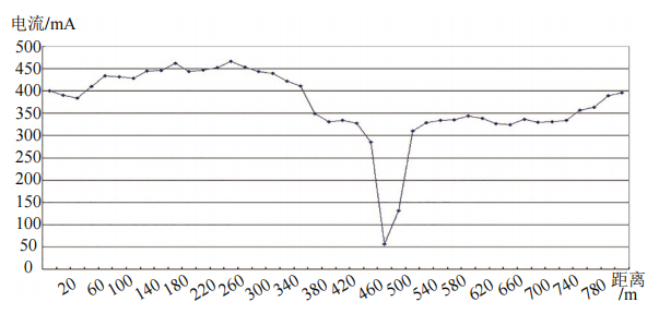 采用交流電流衰減法(PCM),給管道施加一個(gè)檢測電流(由DM大功率發(fā)射機(jī)向管道發(fā)送近似3 Hz直流、4 Hz自選電流和128 Hz/640 Hz定位電流),使用便攜式接收機(jī)跟蹤電流流向,找出閥室電流泄漏區(qū)域,通過分析損失的電流大小,確定管道與接地網(wǎng)的搭接點(diǎn)。