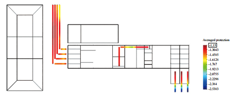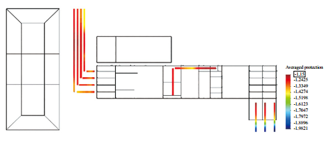 ②陰極保護電位負于鋅包鋼自然電位。當水平接地體為低碳鋼時,控制陰極保護電位負于﹣1.15 VCSE,陰極保護系統(tǒng)需輸出電流4.8 A達到原輸出電流的3倍,鋅包鋼會吸收陰極保護系統(tǒng)電流,顯著增加陰極保護系統(tǒng)的負擔。管道電位分布云如圖 6所示。