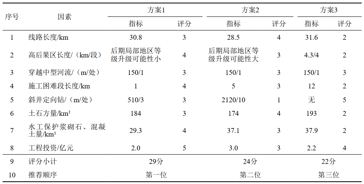 (3)方案比選。通過(guò)對(duì)不同路由方案的各相關(guān)因素進(jìn)行統(tǒng)計(jì)分析與比較,排序推薦,為有關(guān)部門(mén)決策提供支持和依據(jù)。例如,某輸氣管道在項(xiàng)目前期可行性研究中,根據(jù)現(xiàn)場(chǎng)地形地貌、施工難度等條件,對(duì)某段管道提出三個(gè)路由方案進(jìn)行比選(表 1、圖 1)。