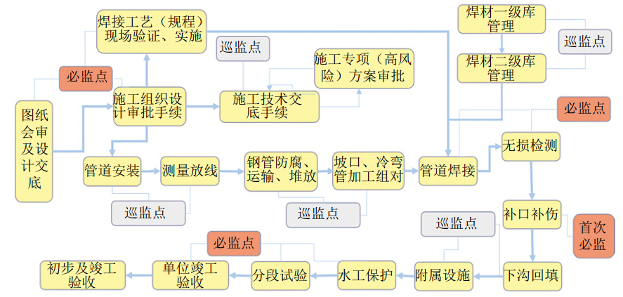 例如,某管道工程于2021年開(kāi)工建設(shè)前,建設(shè)單位依據(jù)《特種設(shè)備安全監(jiān)察條例》和TSG D7006―2020《壓力管道監(jiān)督檢驗(yàn)規(guī)則》、國(guó)家管網(wǎng)集團(tuán)《工程建設(shè)項(xiàng)目質(zhì)量管理暫行規(guī)范》《油氣管道工程質(zhì)量監(jiān)督實(shí)施規(guī)定》,建立了工程質(zhì)量監(jiān)督體系。一是主動(dòng)接受屬地政府的質(zhì)量監(jiān)督,項(xiàng)目開(kāi)工前向?qū)俚卣O(jiān)檢機(jī)構(gòu)申請(qǐng)質(zhì)量監(jiān)督注冊(cè),由屬地政府安排省特檢院(高配)承擔(dān)管道建設(shè)質(zhì)量監(jiān)督,實(shí)施對(duì)壓力管道施工過(guò)程質(zhì)量監(jiān)督和滿足基本安全要求的符合性驗(yàn)證,確保管道建設(shè)階段質(zhì)量可控。二是積極配合國(guó)家管網(wǎng)集團(tuán)內(nèi)部質(zhì)量監(jiān)督,向集團(tuán)工程質(zhì)量監(jiān)督總站申請(qǐng)項(xiàng)目質(zhì)量監(jiān)督注冊(cè)。監(jiān)督總站安排質(zhì)量監(jiān)督分站實(shí)施質(zhì)量監(jiān)督。在國(guó)家管網(wǎng)集團(tuán)和社會(huì)監(jiān)理共同監(jiān)督中,依據(jù)設(shè)置的管道線路、穿越、站場(chǎng)等工程質(zhì)量監(jiān)督要點(diǎn)(圖 2),2022年5月共檢查出設(shè)計(jì)、施工、檢測(cè)、監(jiān)理和建設(shè)單位質(zhì)量問(wèn)題29項(xiàng),其中質(zhì)量實(shí)體8項(xiàng)、質(zhì)量行為14項(xiàng)、HSE問(wèn)題7項(xiàng)。這些監(jiān)督檢查有效推動(dòng)了質(zhì)量保證體系的運(yùn)行,糾正了施工過(guò)程中的質(zhì)量安全偏差,起到了積極作用。
