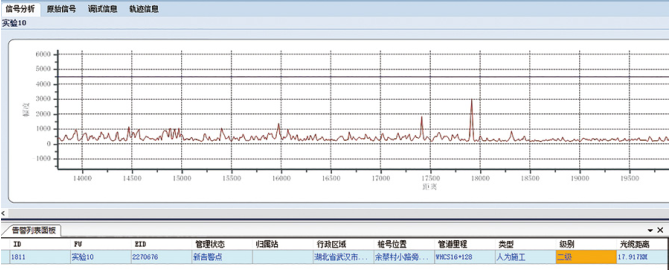 圖 4 光纜振動(dòng)檢測儀上顯示的振動(dòng)信號(hào)及測試長度