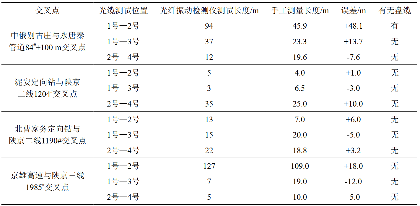( 2)應(yīng)用現(xiàn)狀。截止目前,光纜四點(diǎn)定位法已應(yīng)用在京安城際高鐵、南水北調(diào)、京德高速、京雄高速、榮烏高速、中俄管道、唐山LNG、北燃管道等工程與陜京管道交叉的43處施工現(xiàn)場,實(shí)現(xiàn)了光纜準(zhǔn)確定位和盤纜有效排查。其中,在京安城際高鐵與陜京二線管道交叉點(diǎn)周邊開挖探坑時(shí),共發(fā)現(xiàn)了4條光纜,通過上述方法及時(shí)排查廢棄光纜,確定在用光纜及其位置信息,保證了施工作業(yè)光纜安全。表 2選取4組光纜振動(dòng)檢測儀測試長度與手工測量長度進(jìn)行對(duì)比。