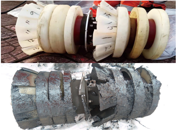 清管階段推進基本順利,4種清管器共平穩(wěn)運行7次,平均速度均在3 m/s左右,清出雜質約30 kg(清出雜質較少)。圖 1是2種典型清管器收發(fā)球前后對比。