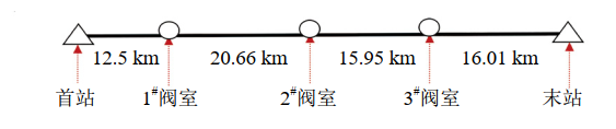 (2)對相關問題的處置措施。圖 2為站場及閥室相對距離圖。當檢測器首次停留在3#閥室前7 km處時,2#閥室和3#閥室之間壓差始終在0.25 MPa左右,若在密封完好的情況下,檢測器可正常行進,但檢測器因自身重量較重,且皮碗破損已較為嚴重,存在泄流現(xiàn)象,需工藝調整建立更大的壓差方可推動檢測器正常行進。決定開通3#閥室放空閥,通過放空牽引方式給檢測器建立新動力,同時通過放空引流可以抽走檢測器前段的粉塵雜質。處置后檢測器順利前行5 km,又停留在3#閥室前2 km處。