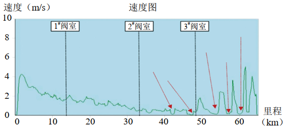 (3)檢測器運行數(shù)據(jù)分析。圖 3為檢測器運行速度曲線,可以看出首站至2#閥室區(qū)間檢測器運行大體平穩(wěn),僅在直管段及彎頭位置存在停頓,此段檢測器皮碗輕微磨損無泄流情況,前方雜質較少。2#閥室至末站區(qū)間,檢測器運行速度較慢,此段皮碗磨損加劇造成一定泄流及檢測器前方雜質量較多造成多處長時間停球。如圖中紅色箭頭所示,檢測器共發(fā)生5次較為明顯的低速停球,后續(xù)停球啟動過程均與工藝操作相符。