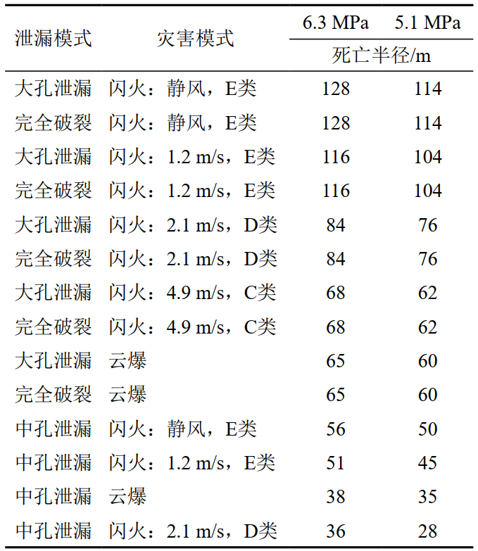 為更直觀比對,采用中國安科院CASST―QRA軟件模擬計(jì)算輸氣管道在各種泄漏模型下的事故后果影響死亡半徑,作為參考。