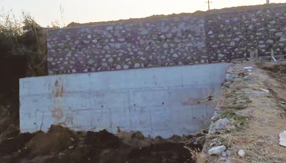 擋土墻是臺(tái)田地最常用工程防治措施,可根據(jù)現(xiàn)場(chǎng)情況采取混凝土擋墻、漿砌石擋墻與干砌石擋墻或其組合的防護(hù)形式(圖 4、圖 5)。針對(duì)臺(tái)田地覆土層較為松軟地帶,可在原防護(hù)基礎(chǔ)之上,修建漿砌石或混凝土排水渠與消力池相結(jié)合的方式排放雨水,防止地基下沉、坍塌。