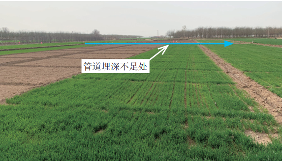 管道穿越農(nóng)田、水渠、溝坎時(shí),因地形受限難以機(jī)械覆土、雨水沖刷造成覆土流失嚴(yán)重或高差較大覆土不易穩(wěn)定等,導(dǎo)致管道埋深不能達(dá)到設(shè)計(jì)要求(圖 6),影響管道安全運(yùn)行及使用壽命。管道埋深不足時(shí),一般采用鋼筋混凝土現(xiàn)澆或預(yù)制蓋板與素土覆蓋相結(jié)合的防護(hù)形式,蓋板尺寸一般為長(zhǎng)3 m、寬0.6 m,厚0.15 m,如遇管道、光纜不同溝地段,可適當(dāng)加寬。采用鋼筋混凝土蓋板防護(hù),可以防止農(nóng)戶在管道上方取土或溝渠清淤,避免管道露管、管道防腐層和光纜損壞,同時(shí)也有效降低大型農(nóng)機(jī)具在管道上方旋耕施工作業(yè)造成第三方損壞事故發(fā)生(圖 6)。