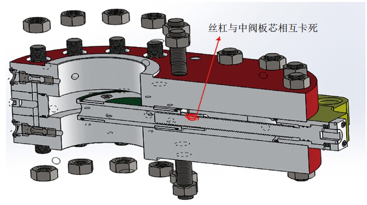 重新擰緊絲杠壓蓋,將頂杠向后松動7 mm,逐漸松開絲杠壓蓋螺栓,發(fā)現(xiàn)絲杠隨螺栓松動向后面移動。此現(xiàn)象說明中閥板芯沒有被上下閥板卡住,在有力的作用下可以使其移動。