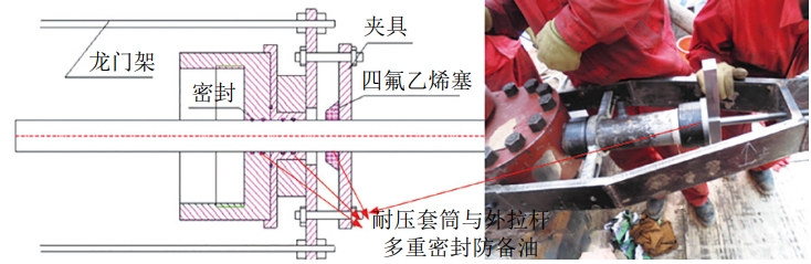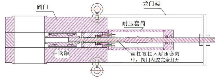 聯(lián)通耐壓套筒和管道,使兩者壓力平衡。觀察整個裝置的各個連接點,用肥皂水檢查氣密性。確保無泄漏后,通過旋轉(zhuǎn)頂杠上部的螺母,緩慢將閥門絲杠拉出,從而打開中閥板(在龍門架的外拉桿上做好中閥板抽出的起始標記,隨時時測量抽出的尺寸,直至達到最終值),如圖 3所示。