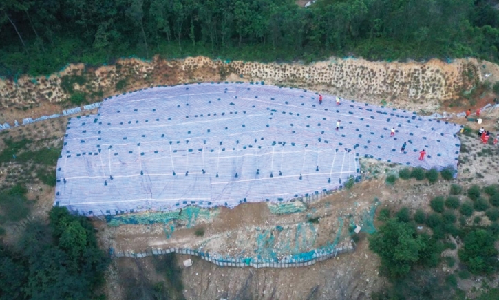 (1)設(shè)置導(dǎo)排水。沿管道順氣流左側(cè)即靠近山脊側(cè)開挖排水溝渠排水,整個橫坡坡面苫蓋彩條布,降低連續(xù)雨水對坡面的影響(圖 1)。